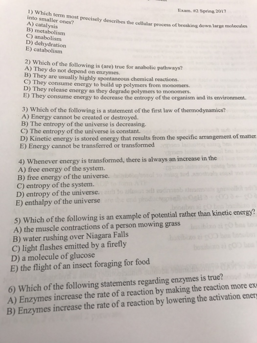 Which terms most precisely describes the cellular process of breaking down large molecules into smaller ones. A catabolism catabolic pathways B metabolism C anabolism anabolic pathways D dehydration. Catabolism catabolic pathways Which of the following is an example of the second law of thermodynamics as it applies to biological reactions.